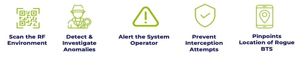 ArrowCell detects and mitigates the presence of an IMSI catcher to ensure awareness of surrounding threats, locates the attackers and disrupts their operation.