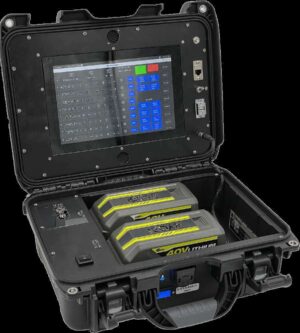 The MGTRON™ uses hot swappable 40V RYOBI™ Lithium batteries used for power tools. The system can supply simultaneously external power for other equipment from 5V to 48V . The system can be configured to use common Makita XGT™ 40V batteries used for power tools in Europe.